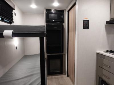 This lightweight travel trailer is perfect for four happy campers. You'll enjoy the front full-size bed, while your guests or little ones take the 28" x 74" bunk beds. There is also a shelf above the bed to keep your things organized. A private bath includes a shower with a toilet so you can freshen up each day without having to leave your camper. You can make your meals on the two burner gas cooktop or in the microwave oven, then take your plate outdoors to eat under the 8' power awning!